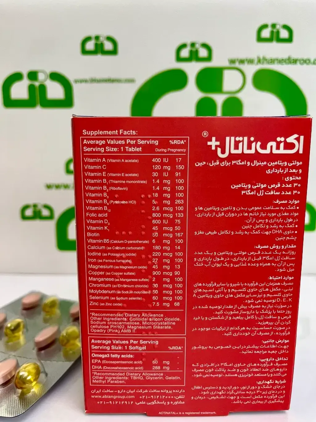 قرص اکتی ناتال پلاس ابیان دارو یکی از مکملهای کامل و پرطرفدار برای مادران باردار و شیرده است که علاوه بر مواد معدنی و ویتامینهای ضروری، حاوی اسیدهای چرب امگا ۳ نیز میباشد.