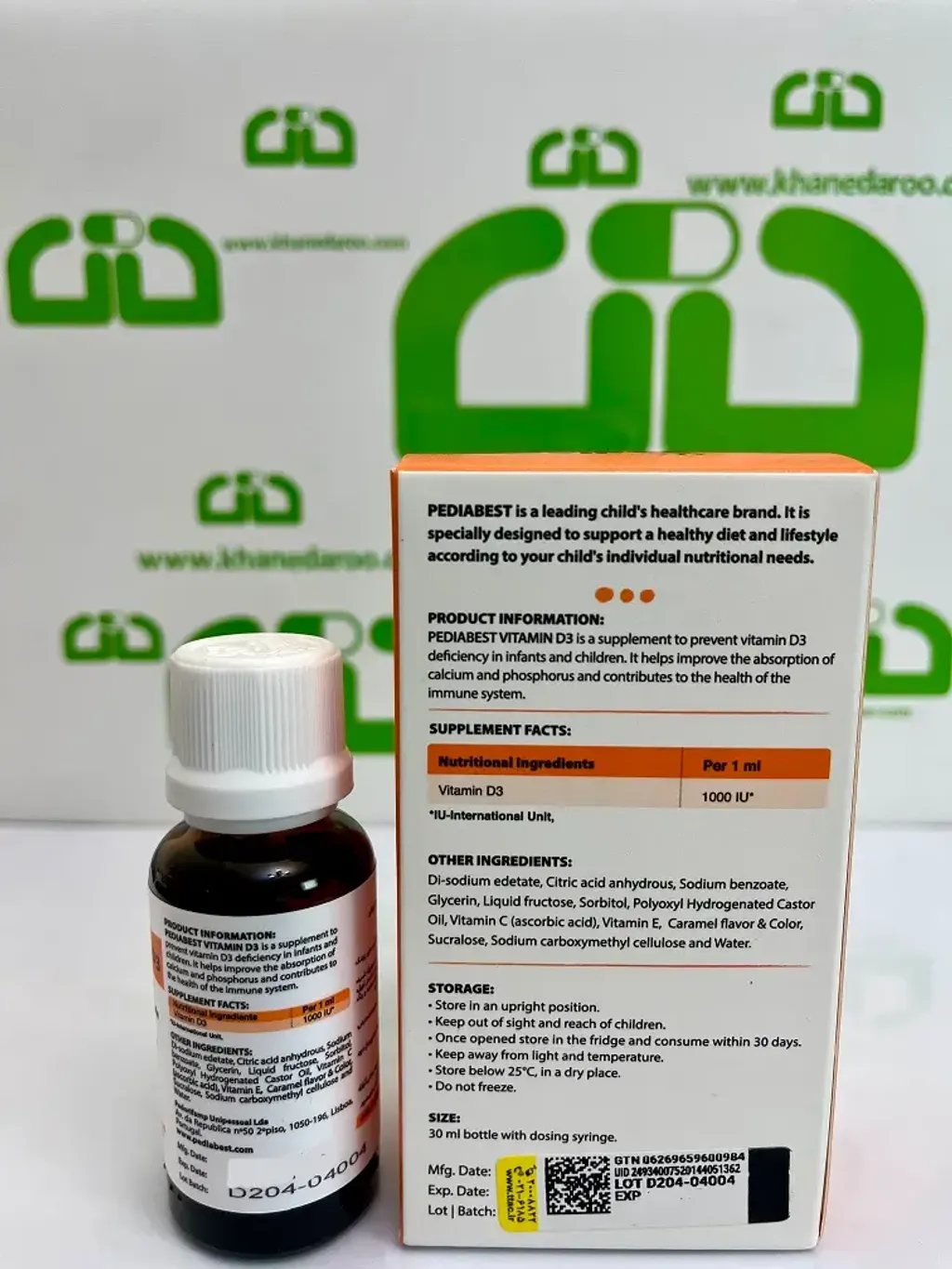 قطره ویتامین D3 پدیابست یکی از بهترین مکملهای ویتامینی برای رشد سالم نوزادان و کودکان است که با فرمولاسیون ملایم و جذب بالا، از بروز نرمی استخوان جلوگیری کرده و سلامت استخوان و دندان را تضمین میکند. برای خرید و مشاهده قیمت قطره ویتامین D3 پدیابست 30 میلیلیتری میتوانید به داروخانه آنلاین خانه دارو مراجعه کنید. همچنین این محصول در داروخانه خانه دارو در شهر پردیس نیز به صورت حضوری قابل تهیه است.